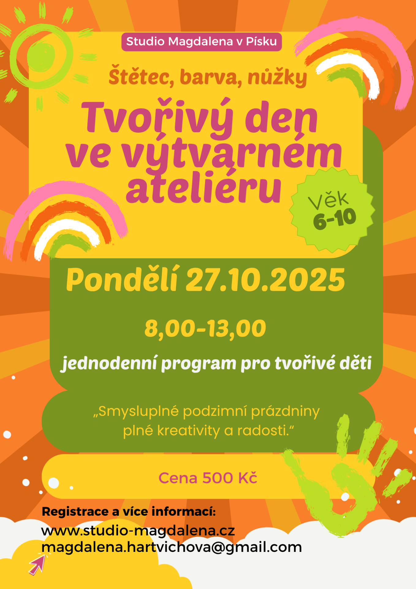 Náplní tvořivého dne bude zábavná výtvarná činnost zahrnující malbu, koláže a jiné tvořivé aktivity.